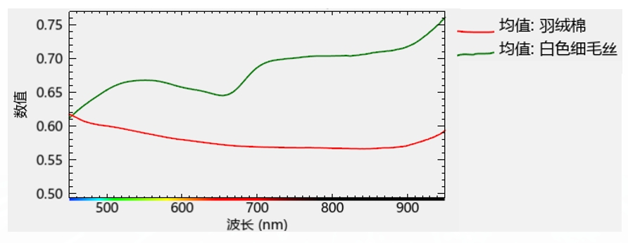 根據(jù)樣品反射率可分辨出羽絨棉和白色細(xì)毛絲;其余三組樣品根據(jù)反射率不太好區(qū)分